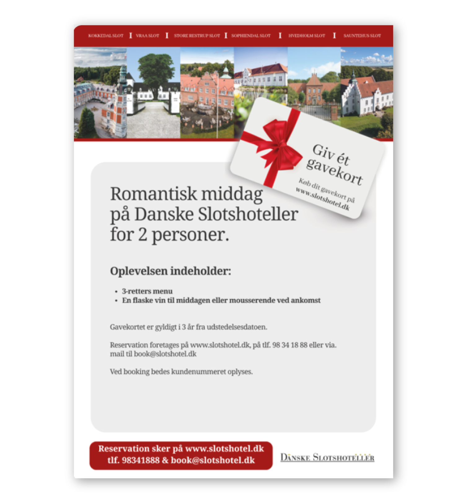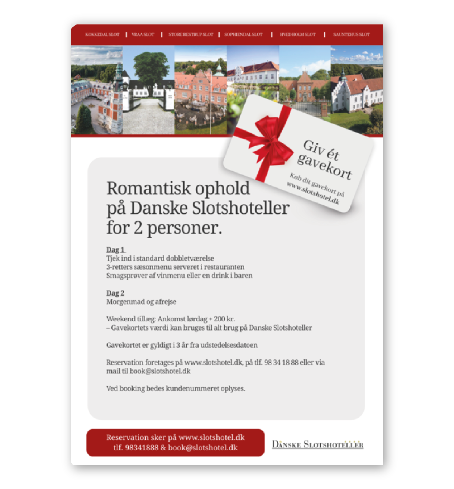 Eventuelle tillæg betales i forbindelse med reservationen. Når gavekortet indløses, får modtageren adgang til aktuelle opholdspakker og dagsaktuelle priser – og er dermed sikret den bedst mulige oplevelse på et af Danske Slotshoteller.