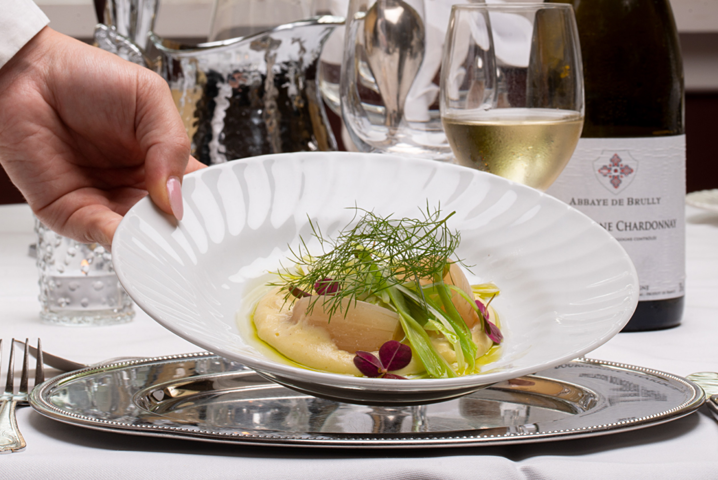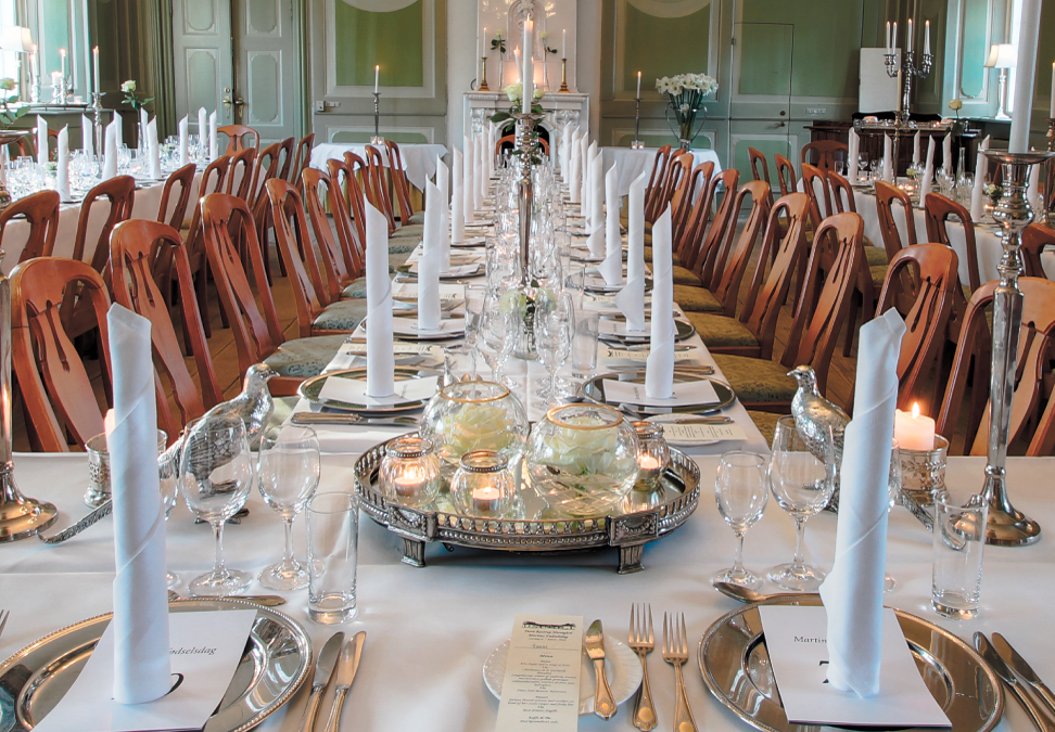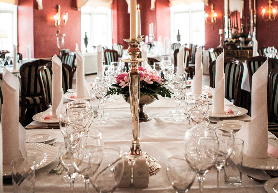 I Riddersalen venter en smukt opdækket sal med friske blomsterdekorationer og en særlig stemning af romantik. I vil i samarbejde med vores kok og vintjener sammensætte aftenensmenu og vine.